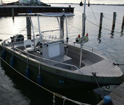 Die "Oliva" ist ein robustes Alu-Sportfischerboot für max. 6 Personen. Sie können die "Olivia" im Stadthafen Ribnitz in Ribnitz-Damgarten übernehmen. Die "Olivia" verfügt über ein offenes Cockpit mit Centerconsole und T-Top mit zwei Schalensitzen. Vier weitere Sitzplätze sind vorhanden.